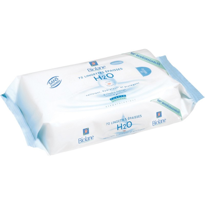 Lingettes H2O Biolane nettoyantes et douces pour la peau des bébés, sans rinçage, idéales pour le change et la toilette quotidienne.