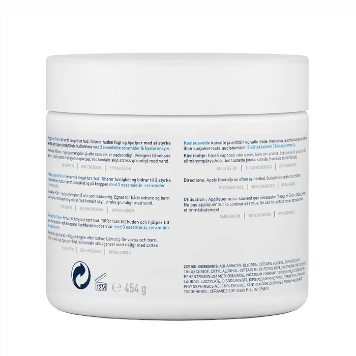 Formule INCI : AQUA / WATER • GLYCERIN • CETEARYL ALCOHOL • CAPRYLIC/CAPRIC TRIGLYCERIDE • CETYL ALCOHOL • CETEARETH-20 • PETROLATUM • POTASSIUM PHOSPHATE • CERAMIDE NP • CERAMIDE AP • CERAMIDE EOP • CARBOMER • DIMETHICONE • BEHENTRIMONIUM METHOSULFATE • SODIUM LAUROYL LACTYLATE • SODIUM HYALURONATE • CHOLESTEROL • PHENOXYETHANOL • DISODIUM EDTA • DIPOTASSIUM PHOSPHATE • TOCOPHEROL • PHYTOSPHINGOSINE • XANTHAN GUM • ETHYLHEXYLGLYCERIN (FILD213768/2)