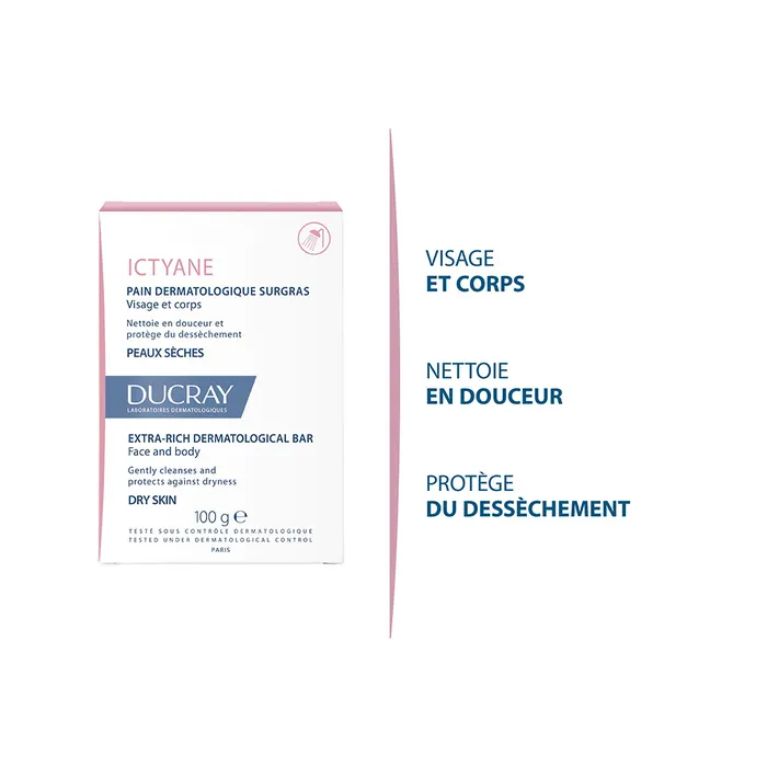 Le Pain Dermatologique Surgras Ictyane, garanti sans savon, nettoie en douceur les peaux sèches et fragiles grâce à sa base lavante.
