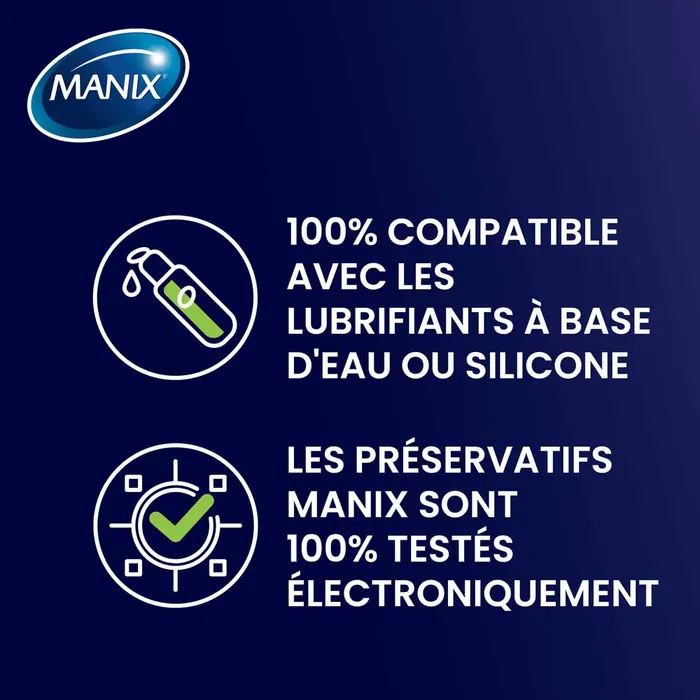 Tous les préservatifs Manix sont testés électroniquement à 100 % pour assurer une protection optimale contre les IST et les grossesses non désirées. Conformes aux normes de qualité les plus strictes, ils associent sécurité, fiabilité et plaisir. Livrés dans un emballage discret, les préservatifs Manix Endurance Time Control garantissent une expérience intime en toute confiance. Avec plus de 30 ans d’expertise, Manix reste la marque de référence du bien-être sexuel, offrant des produits alliant innovation, plaisir et sécurité pour une sexualité épanouie et exaltée.