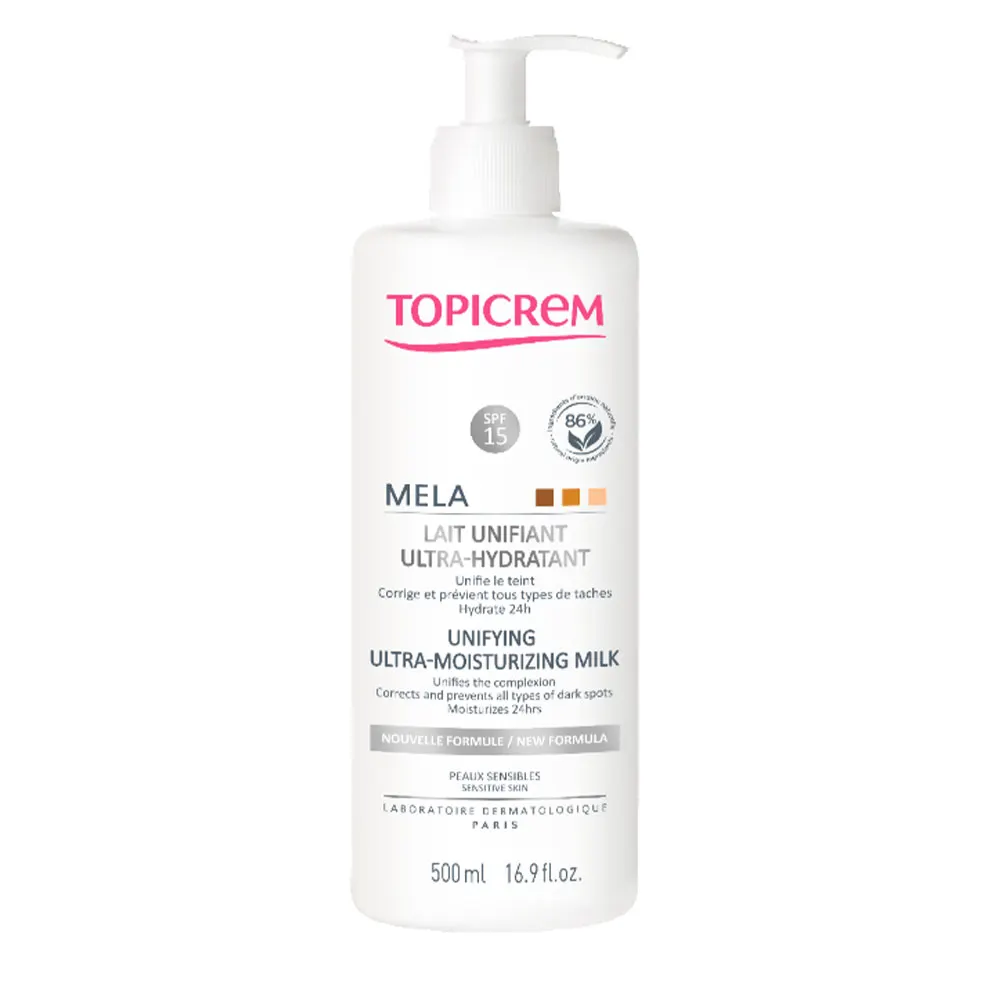 MELA Lait Unifiant Ultra-Hydratant est un lait corps unifiant pour les peaux sensibles. Il corrige efficacement tous types de taches et prévient leur apparition tout en hydratant intensément 24h*. Sa protection SPF15 protège la peau des UVA et UVB. La peau est unifiée et naturellement éclatante.